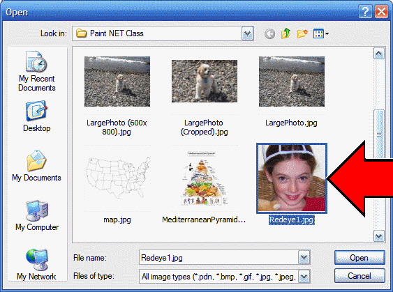 Locate the "Redeye1.jpg" file and double click to open it, or click the "Open" button. You can also locate it in Windows Explorer, in your "Pictures" folder, or wherever it is, and right click on the picture, select "Send To", and then click on "Paint.NET".
