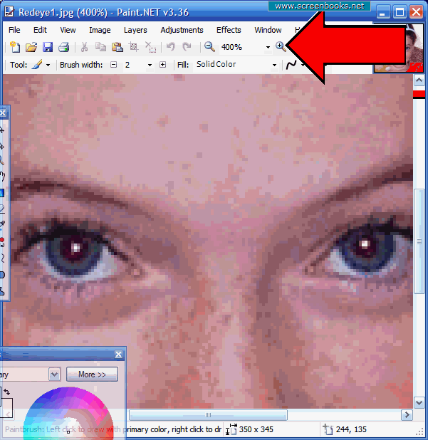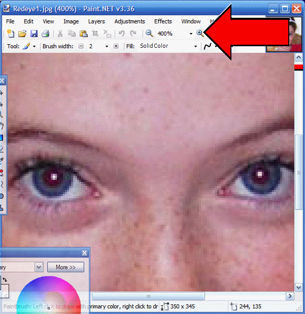 To fix redeye, you want to be zoomed in on the face in question. In this case, simply click the "plus" icon several times until the zoom level is 400%, as shown below. This makes it easy to work on the eyes.
