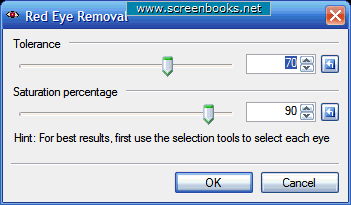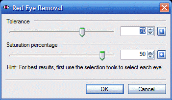 The "Red Eye Removal" dialog box will come up. For each specific case, you will need to move the two slider bars experimentally, to see what looks best. In this case, just move the top slider bar to the left, until the value goes from 70 to 5.